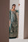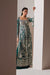 Ameera is a mesmerizing viridescent emerald organza flared gown, adorned with modern, rich silver dhabka, hand beaded details and captivating cape sleeves, elegantly finished with hanging beads paired beautifully with organza duppata heavily embroidered on borders. The ensemble is perfectly complemented by sleek raw silk trousers.